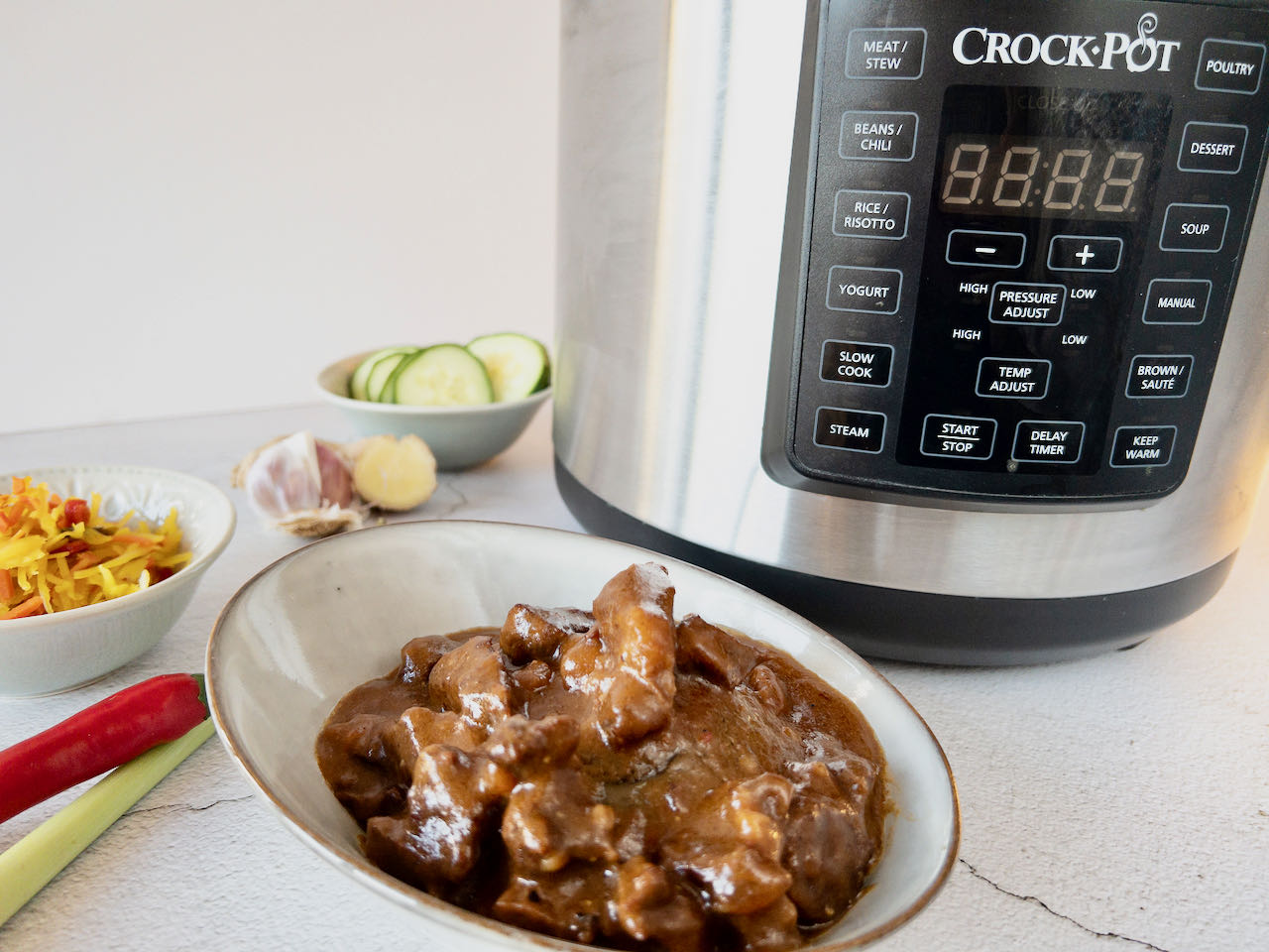 Als je stoofvlees maakt, of dat nou een Indonesische versie of een Boeuf Bourguignon is, is tijd altijd een dingetje. Want stoofvlees heeft tijd nodig om lekker zacht en mals te worden. In een normale pan staat het vlees dan al gauw 2-3 uur op. In de slowcooker kun je het rustig ‘s ochtends aan zetten en dan tegen de avond eten. Maar wat nou als je geen tijd hebt? Dan biedt de multicooker (of instant pot) uitkomst. Hiermee ben je in ongeveer 3 kwartier klaar! Doordat het voedsel onder hoge druk wordt gebracht gaat het garingsproces een stuk sneller. Vandaar dat je stoofgerechten in de multicooker supersnel klaar zijn.