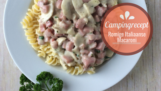Het tweede recept uit de serie “Koken op de camping” is een heerlijke pasta. Macaroni is zo’n gerecht dat bijna iedereen wel maakt op vakantie. Makkelijk snel te maken en bekende ingrediënten. Je kunt natuurlijk een zakje kant en klaar saus meenemen, maar ik wil je hier laten zien dat je ook op vakantie de pakjes en zakjes best thuis kunt laten. Met wat kruiden en ingrediënten die je op plaats van bestemming prima kunt kopen in een willekeurige supermarkt kun je prima uit de voeten. Doordat deze pasta lekker romig en zacht is vinden ook kinderen dit gerecht om te smullen. Daarnaast is dit ook typisch zo’n gelegenheid waarbij ze je even kunnen helpen. Het snijden van de ham is zo’n leuk klusje en het knippen van de peterselie is ook dankbaar werk. En daarna: smullen van een heerlijke maaltijd!