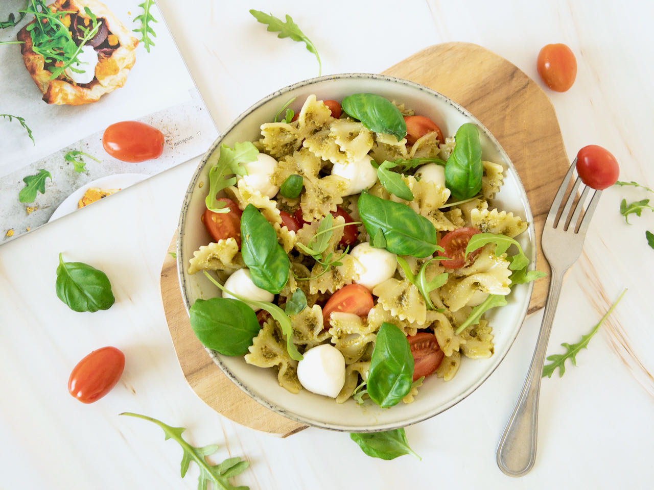 Een salade op zijn tijd vind ik heerlijk. Soms kies ik voor een groene salade zoals deze Caesar salad, maar deze keer wilde ik iets dat wat meer zou vullen. Dat werd deze makkelijke pastasalade met pesto en mozzarella.