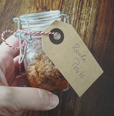 Hoe leuk is dat? Wie mij via Gezin over de Kook op Facebook volgt, heeft al gezien dat ik een potje met heerlijke rode pesto gekregen heb. Ik heb namelijk een hele leuke collega die ook de lekkerste dingen maakt in de keuken. Ze was op zoek naar een goed recept voor groene pesto, dus ik gaf haar mijn favoriete Jamie Oliver pesto recept. En omdat ze met haar dochter al een prima rode pesto gemaakt had, kwam ze die nog even langs brengen. Ik kan je verzekeren, deze is ook superlekker! Ik moest dus het recept even van haar lospeuteren, maar dat gaf ze me graag (bedankt Hanny!).