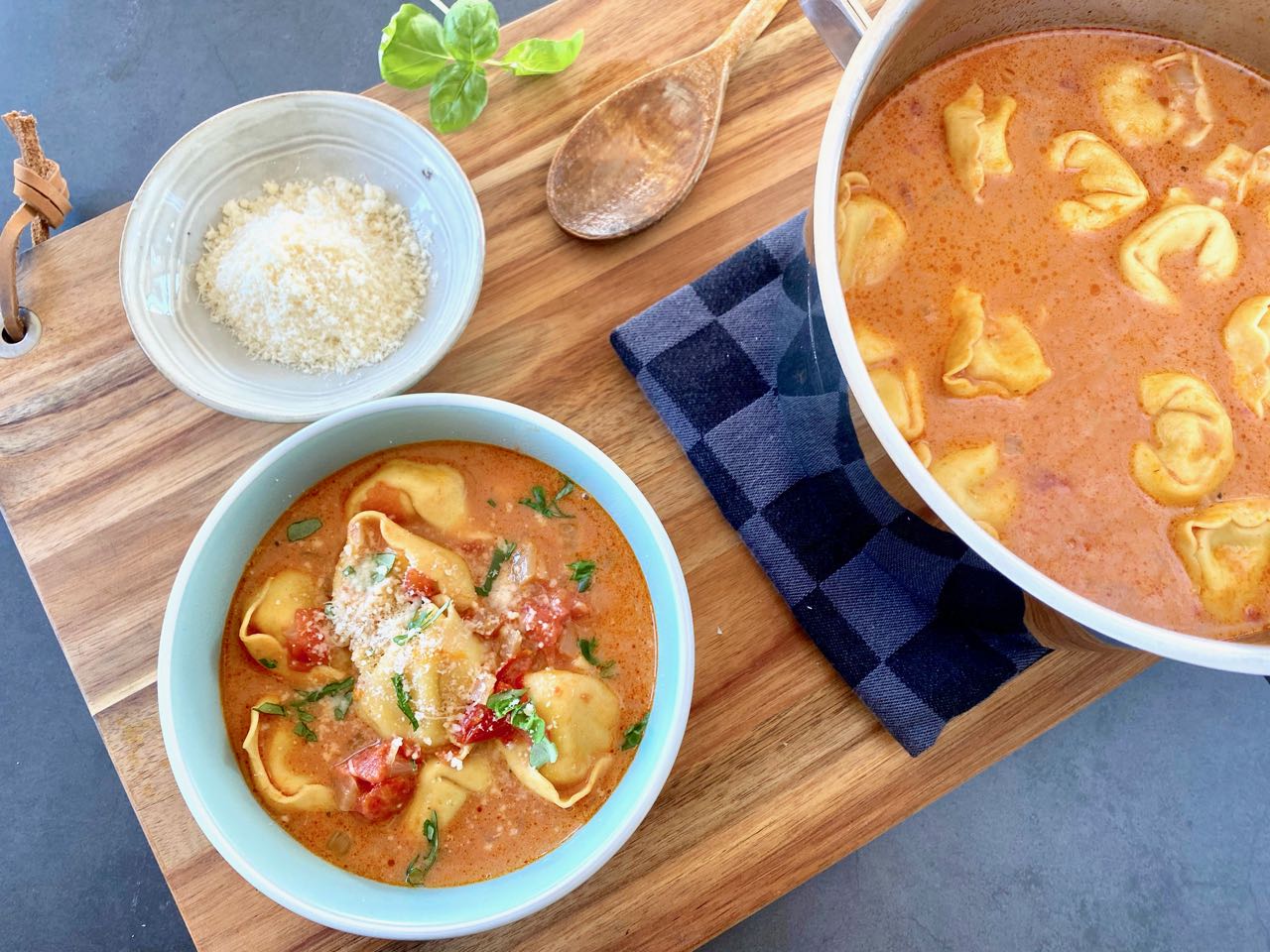 Deze tomatensoep met tortellini heeft uiteraard een Italiaanse twist door de toevoeging van de basilicum en wat Parmezaanse kaas. Het is een heerlijke maaltijdsoep geworden die je zo kunt eten, of met een lekker stukje rustiek brood. Ik heb gekozen voor tortellini met kaas, maar je kunt natuurlijk variƫren naar smaak en verkrijgbaarheid.